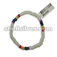 Bracelet 7.5 inches in 7-8 mm white shell heishe, 6 mm flat pukalet silver coated and 7-8 mm wood pukalet green with splashing. |