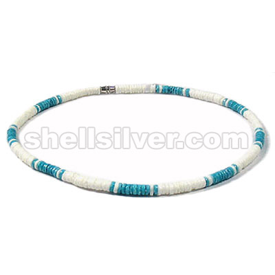 Necklace 16 inches in 8 mm and 6 mm wood beads black, 5 mm silver balls, 20 mm coco pukalet black, 20 mm violet oyster beads blocking inlay and 80 mm violet oyster round blocking inlay pendant. |