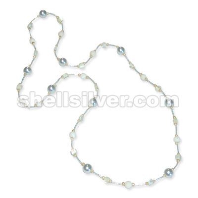 Product Id: JEN6241Necklace 32" in 2-3mm coco beads bleach white, 2mm glass beads white, acrylic crystal, 25mm capiz sh more..