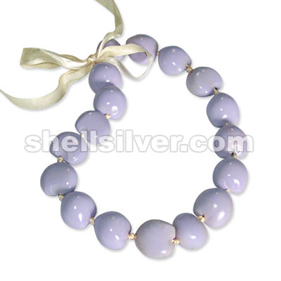 Necklace 18 inches in white shell square cut with splashing, nasa shell white, 8 mm silver coated flat pukalet, 8 mm coco pukalet black and 7-8 mm coco pukalet fuchsia and 7-8 mm white shell heishe. |